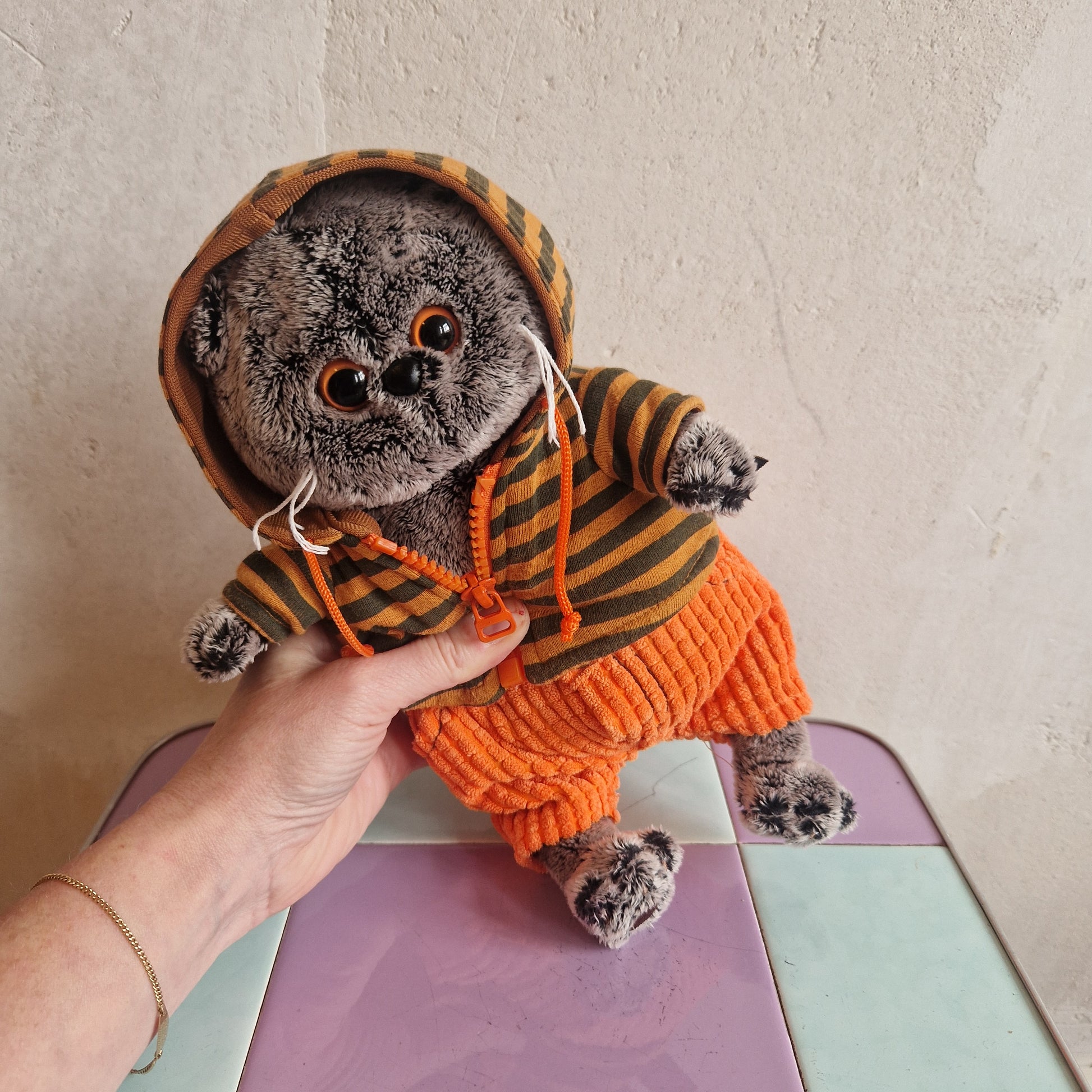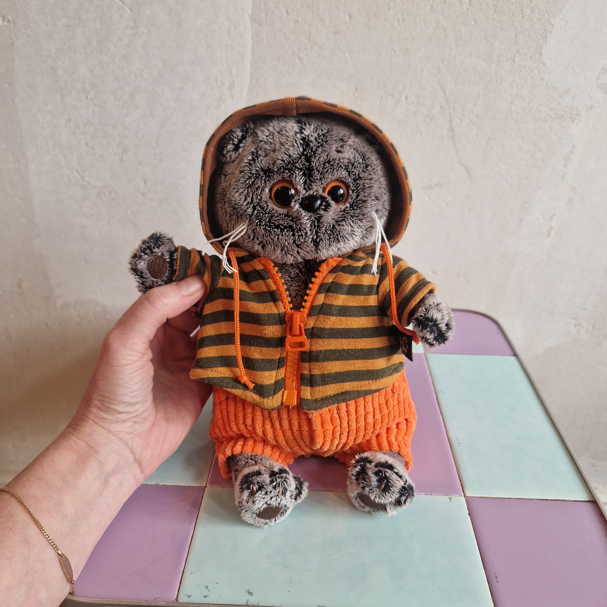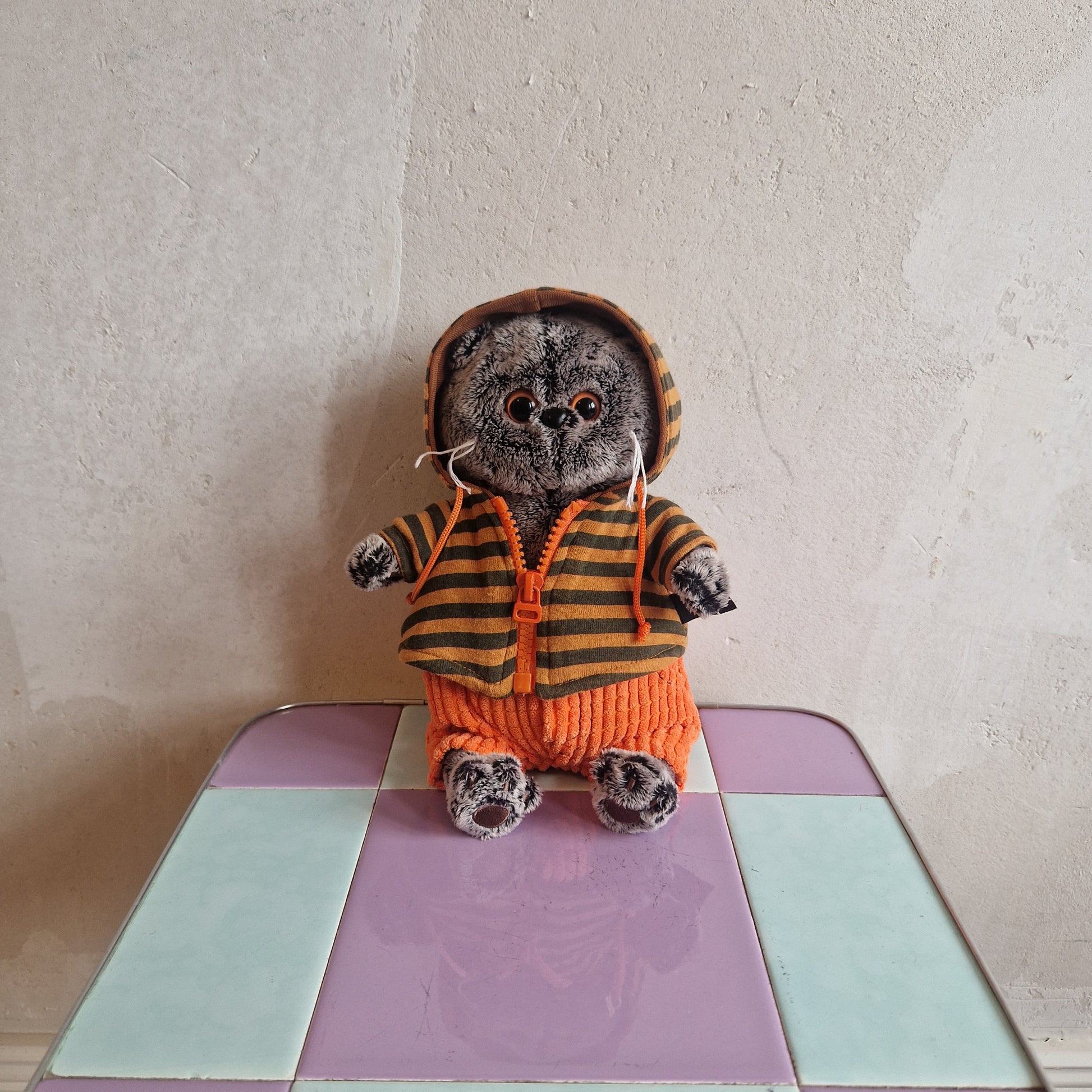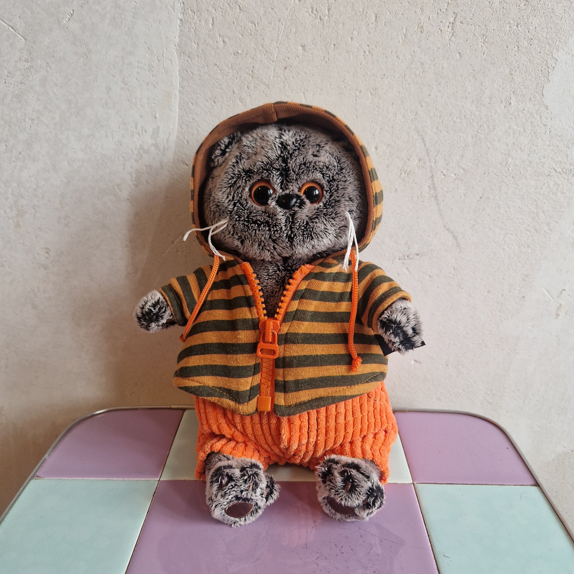 Hey you! I am a Scottish Fold Cat with cute eyes and whiskers and want to be your new best friend :) Also I am pretty stylish with an orange striped zip-up hoodie and orange corduroy-style pants.