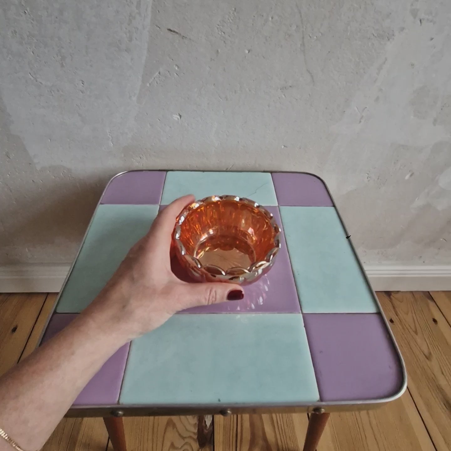 Beautiful little bowl with a Leaf & Beads pattern, made from carnival glass.