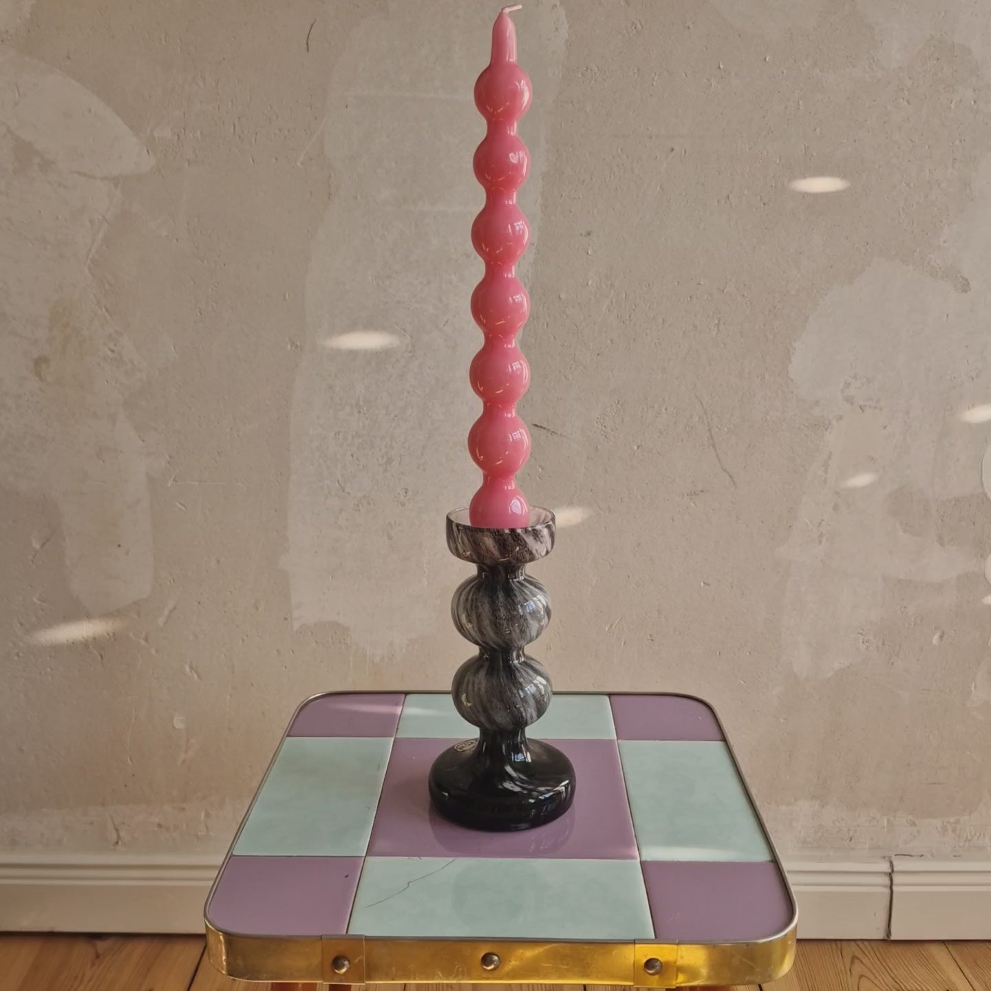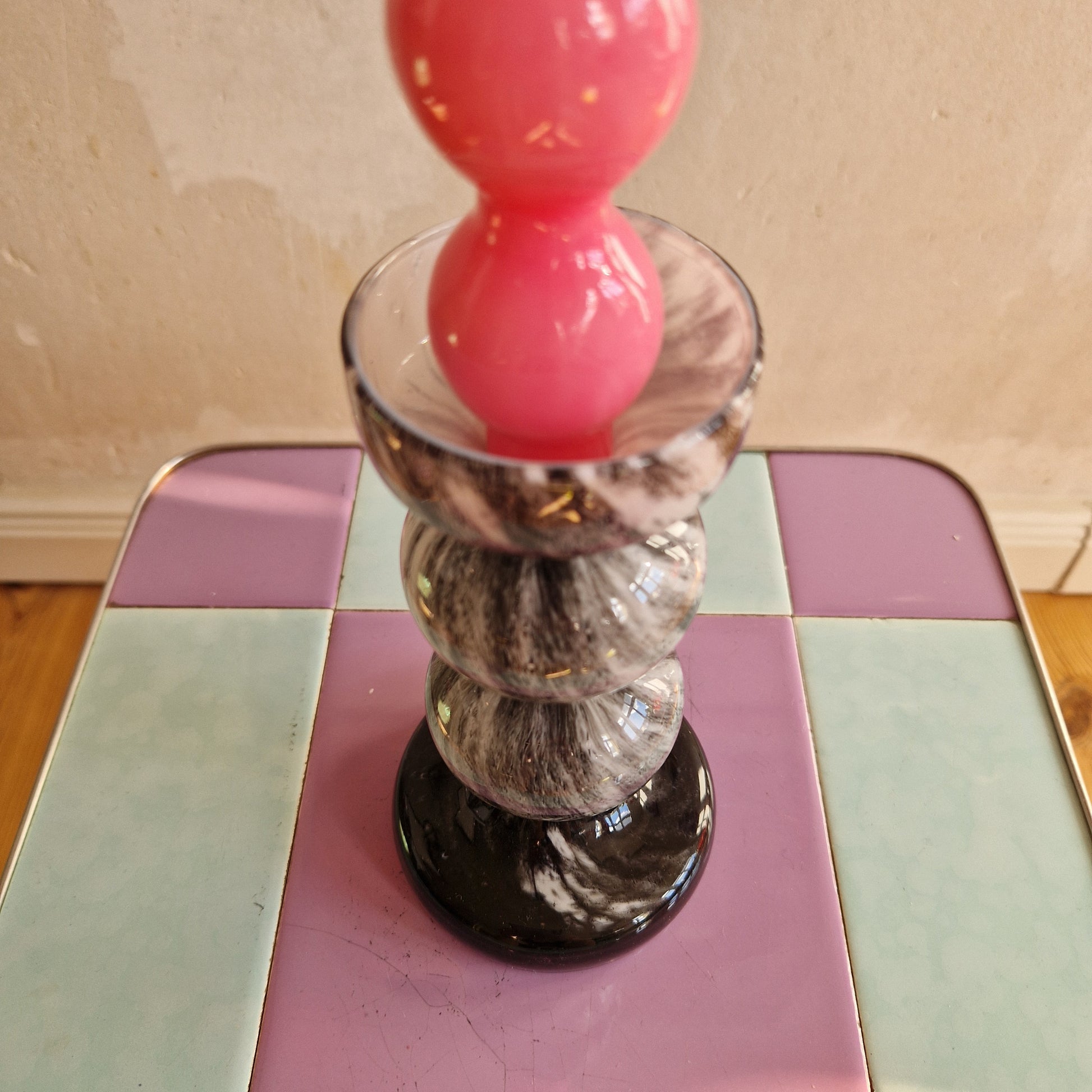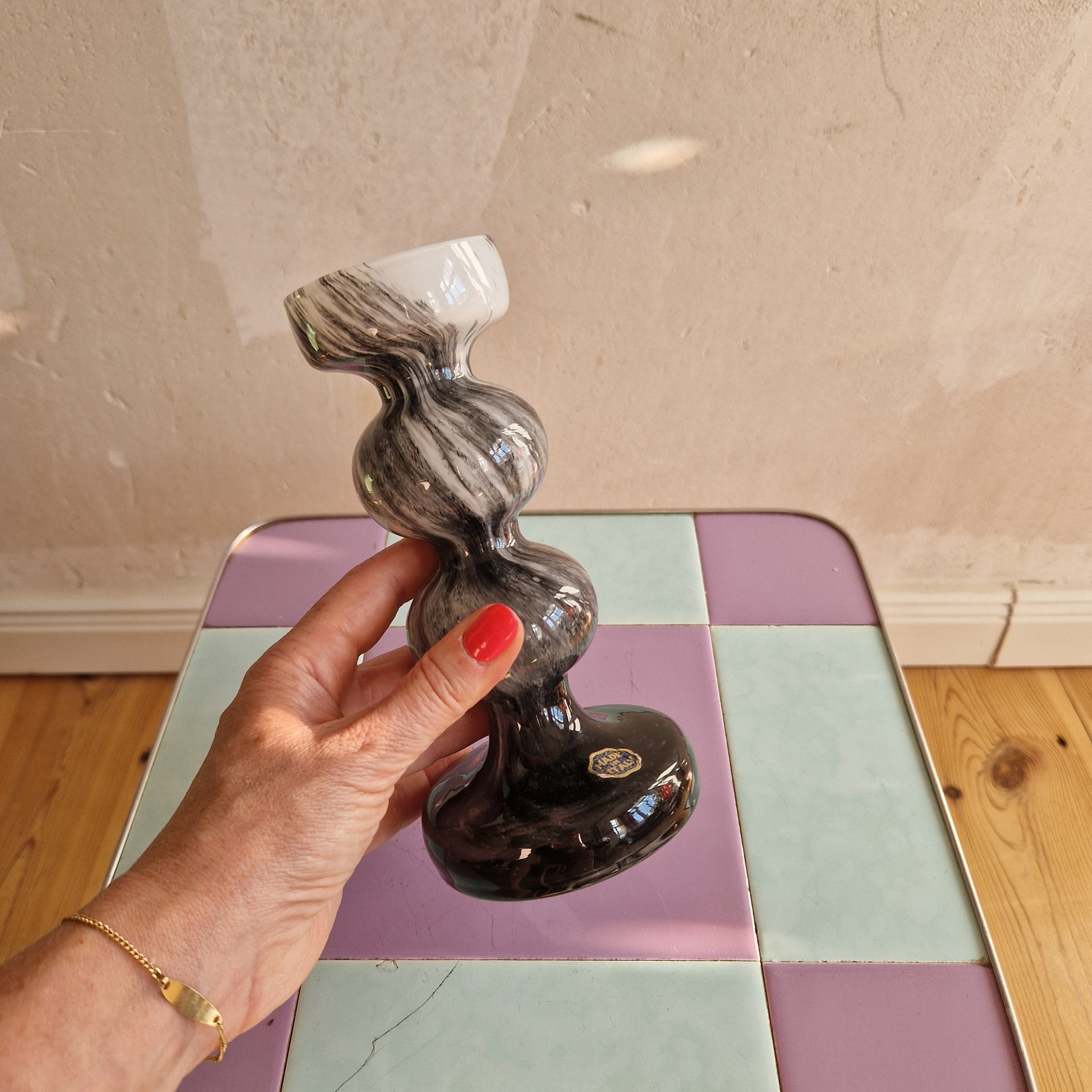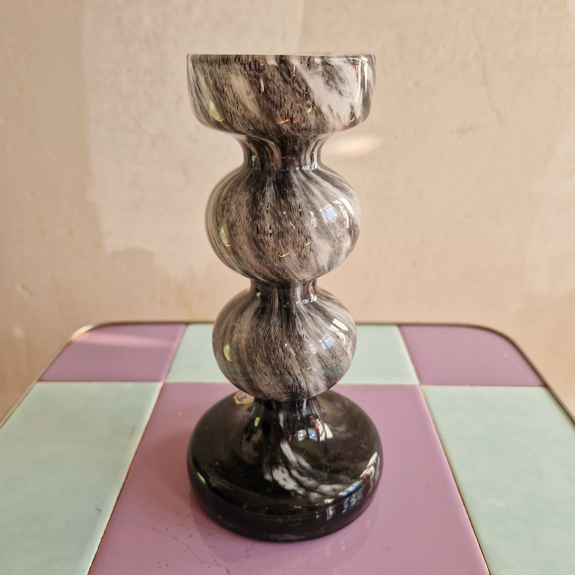This beautifully bubbly hand-blown candle holder is made with a gorgeous colour swirl of black and white. It can also be used as a vase. Most probably from the 70s.